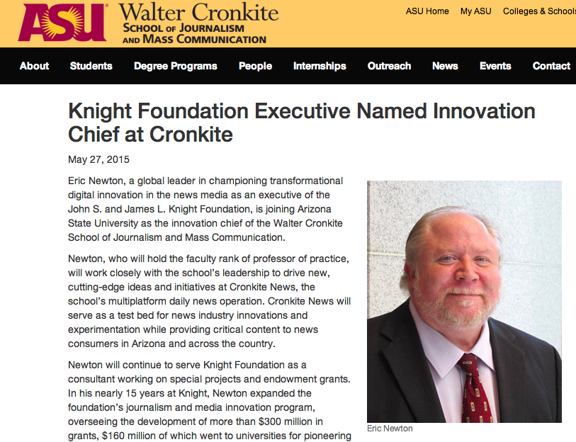 Now Newton has joined Callahan’s team as the Cronkite school’s innovation chief. According to ASU’s announcement, Newton “will work closely with the school’s leadership to drive new, cutting-edge ideas and initiatives at Cronkite News, the school’s multiplatform daily news operation. Cronkite News will serve as a test bed for news industry innovations and experimentation while providing critical content to news consumers in Arizona and across the country.”