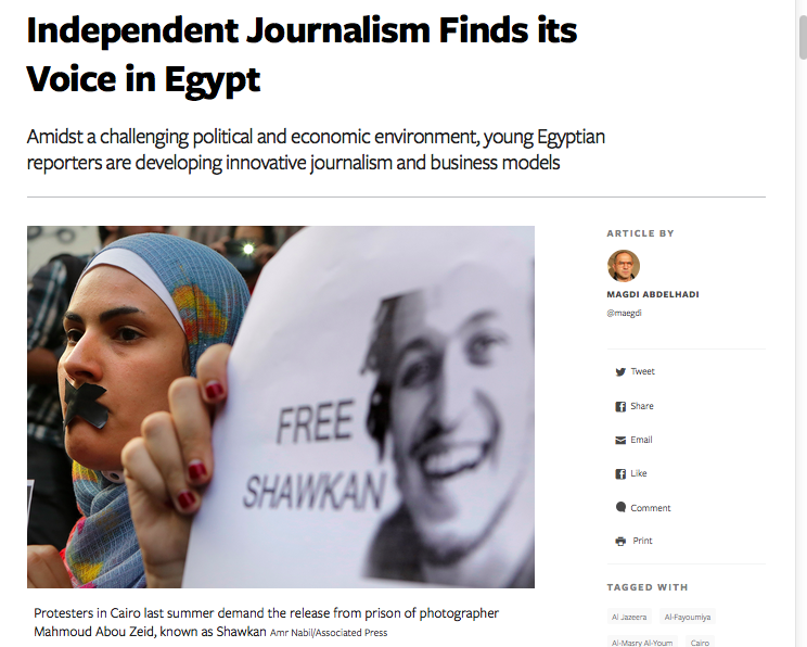 Magdi Abdelhadi has a nice piece in Nieman Reports about the struggles of independent media in Egypt. Among other things it highlights the work of Mada Masr and its editor, Lina Attalah (American University in Cairo ’04):